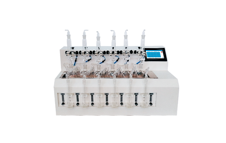 1.大容量反应瓶,可同时处理多个样品。 2.恒温水浴加热,具有快速自动恒温控制系统,加热温度可以手动设定。 3.每个样品的氮气流量独立控制调节或关闭,针阀气体流量计准确控制和显示气体总消耗量。 4.由升降位置固定旋钮调节样品架及配气系统,旋转样品架的升降,正面安装样品,操作方便。 5.盐酸口、气体进气口、出口三口一体且相互区分开,不干扰操作。